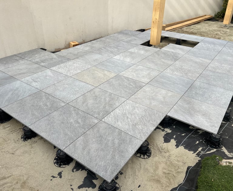 Nous concevons des terrasses en bois et carrelage sur plots, gazon synthétique pour embellir votre espace extérieur.